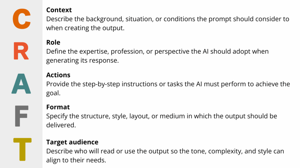 The CRAFT method organizes a prompt into five essential components that guide the model more effectively.